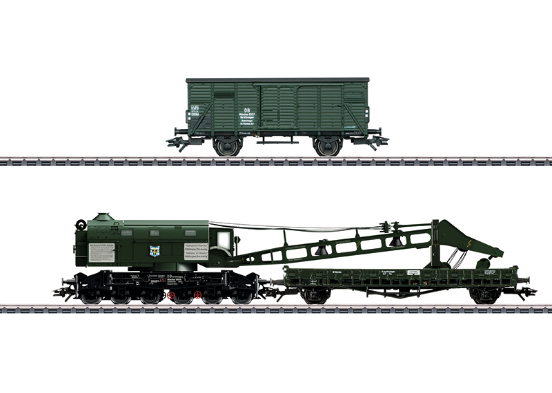 Vorbild: 6achsiger Eisenbahnwagen-Drehkran mit Dampfantrieb Bauart Ardelt mit einer Tragfähigkeit von 57 t mit Kranschutzwagen (Umbau aus Rms Stuttgart) und Gerätewagen der Deutschen Bundesbahn (DB). Farbgebung des Dampfkrans flaschengrün. Betriebsnummer München 6664. Betriebszustand um 1958.
