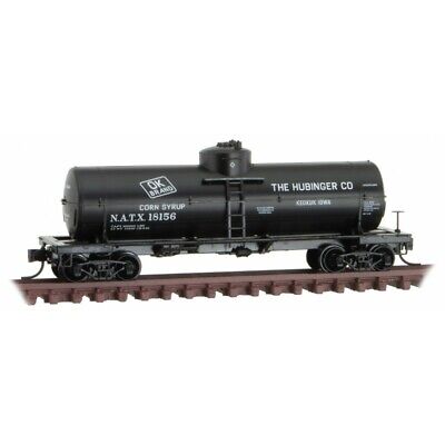 This 39’ single dome tank car is black with white lettering and runs on Bettendorf trucks. Built in 1957, this uninsulated tank car was owned by NATX and leased to the Hubinger Company of Keokuk, Iowa, and was used for corn syrup loading. The J.C. Hubinger Brothers Company was founded in 1887 and was a producer of starch.