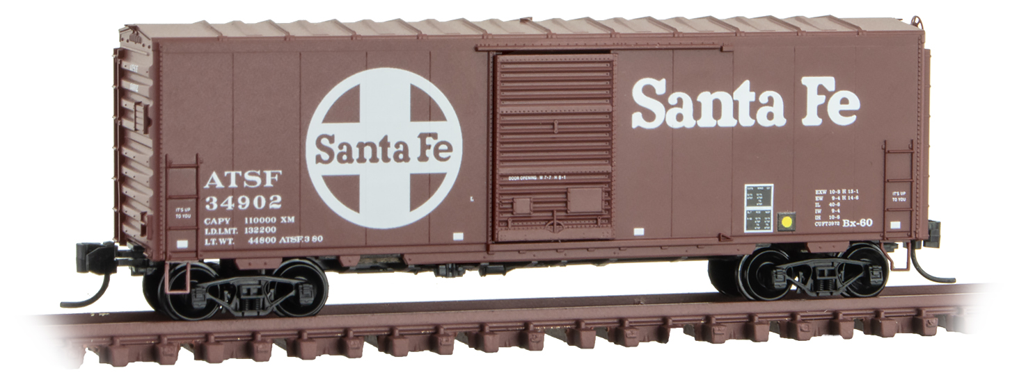 This 40’ standard box car with single door, full ladders and no roofwalk is brown with white lettering and runs on Bettendorf trucks. This car was rebuilt and repainted in the 1970s, and upgraded in March of 1980. Founded in 1859, the Atchison, Topeka & Santa Fe was one of the largest railroads in North America until 1996, when it merged with Burlington Northern to form BNSF.