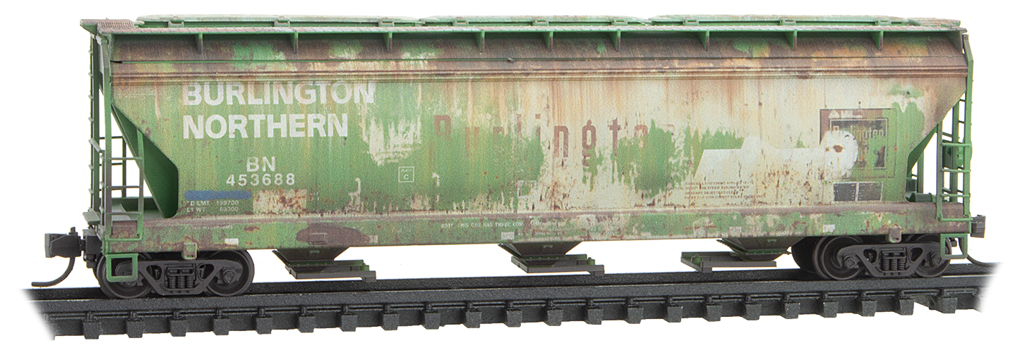 This 3-bay covered hopper with Barber Roller Bearing trucks was built in April 1967 by American Car & Foundry for the Chicago, Burlington & Quincy. In 1970, CB&Q, SP&S, GN, and NP merged to form Burlington Northern, and this 3-bay Centerflow covered hopper was repainted into BN Green. Burlington Northern continued to operate until 1996, when it merged with ATSF to form BNSF