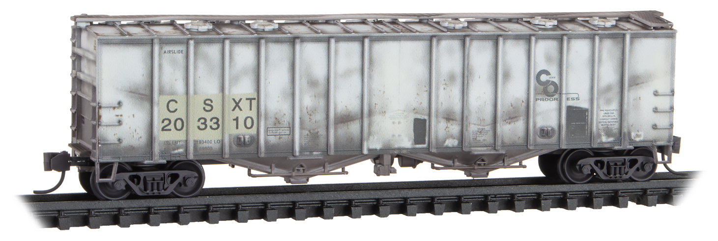This 2-bay covered hopper is tan with black lettering and runs on Barber Roller Bearing trucks. Built in 1970 for Western Maryland, this 2,970 cubic-foot capacity hopper eventually made its way to CSX in the 1980s and was used to transport high-density granular commodities such as sand.