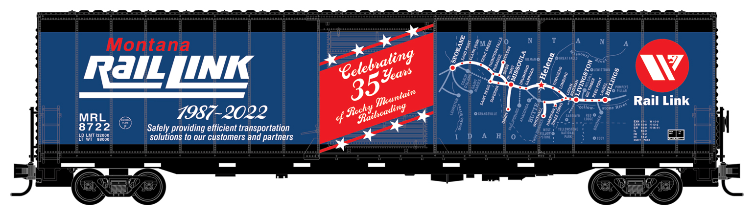 Founded in 1987 Montana Rail Link is a privately owned Class II railroad based primarily in the State of Montana, with trackage and trackage rights into Idaho and Washington, following former Northern Pacific lines. Montana Rail Link is celebrating their 35th Anniversary in 2022, and in recognition of this achievement, this 60’ high-cube boxcar features a locomotive inspired paint scheme and MRL route map.