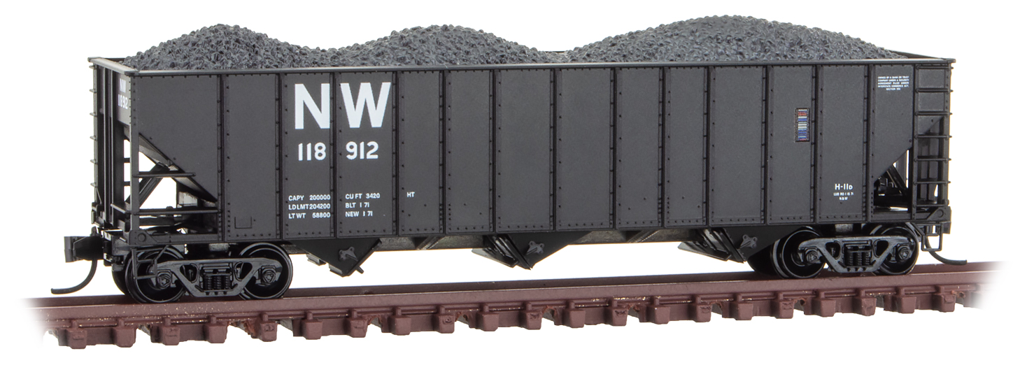 These 100-ton 3-bay open hoppers with rib sides and coal load are black with white lettering and run on Barber Roller Bearing trucks. Built in 1971 in an order of 4,000 cars for Norfolk & Western Railroad, it was painted in the new simplistic “NW” scheme. This car was used in coal service and had a 3,420 cubic foot capacity. Norfolk & Western was a Class 1 railroad headquartered in Roanoke, Virginia. Today, it is now part of the Norfolk Southern system following a 1980 merger with Southern Railway.