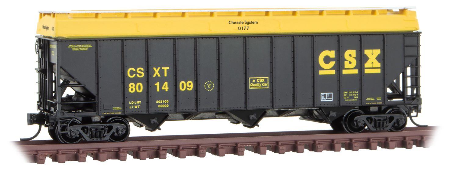 This 100-ton 3-bay open hopper with rib sides is black with yellow lettering and runs on Barber Roller Bearing trucks. Serviced in 1989, this hopper belonged to a 200-car series, 801401-801457. With a 3,418 cubic-foot capacity, it also had a “hopper topper” added during seasonal surges of grain and allowed the car to switch between coal service and grain service. Cars were washed thoroughly and the topper was added to the car, making in essence, a weatherproof covered grain hopper.