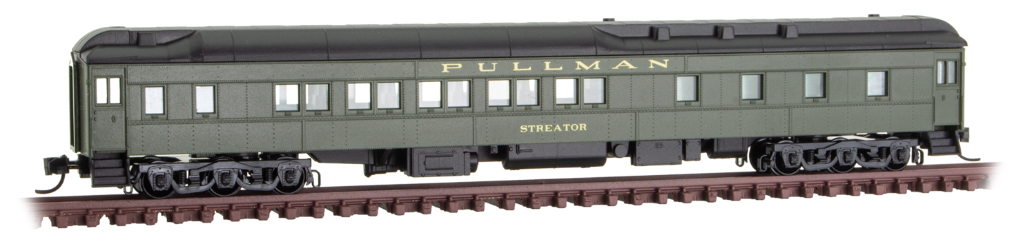 This 10-1-2 heavyweight sleeper car is Pullman green with gold lettering and runs on 6-wheel passenger trucks. Built in the early 1900s, it served on Union Pacific trains through the 1940s. Union Pacific was founded in 1862 and was part of the first Transcontinental Railroad in the United States. It continues to operate today as one of the largest Class 1 railroads in North America with over 32,000 miles of track.