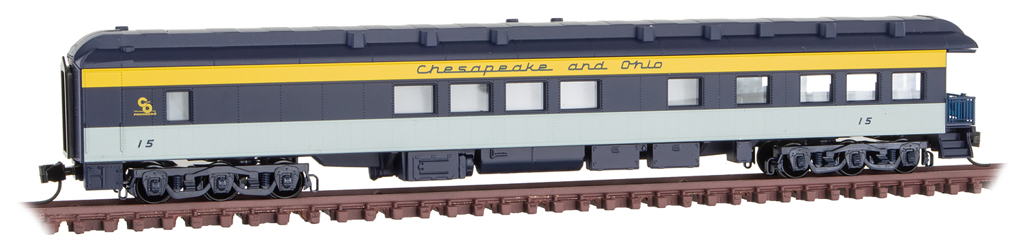 This 3-2 heavyweight modernized business car is painted in the tri-color scheme and runs on 6-wheel passenger car trucks. Built for the W.F. Lenny Co. in 1926 by Pullman, this business car was later purchased by Pere Marquette and finally became C&O #15 in 1947. Used by C&O officials to examine right-of-ways and conduct company business, it continued to serve for C&O through the 1960s before being retired.