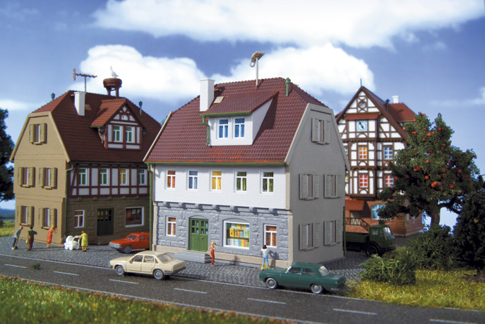 Dieses zweistöckige Haus mit Walmdach verfügt über einen kleinen Geschäftsraum mit Schaufenster im Untergeschoss. Maße: 82 x 65 x 105 mm