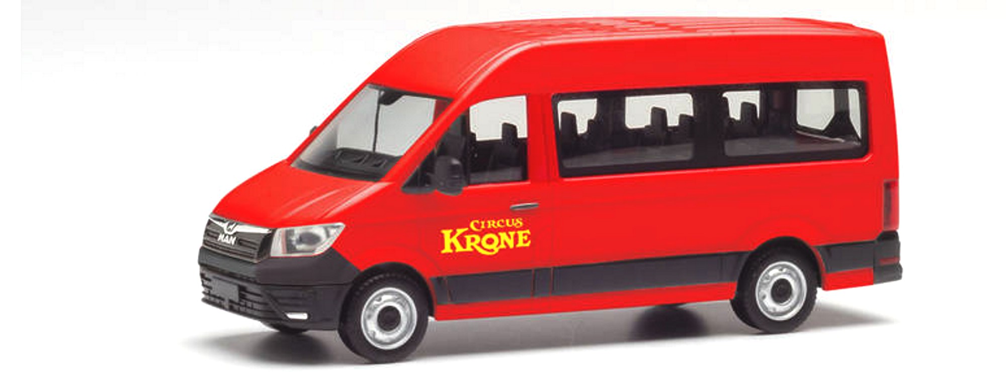 Der in München ansässige Circus Krone setzt nun auch im Bereich der kleineren Fahrzeuge auf die Marke MAN. Der aktuelle MAN TGE ist in rot gehalten und trägt seitlich das Logo des Circus Krone.