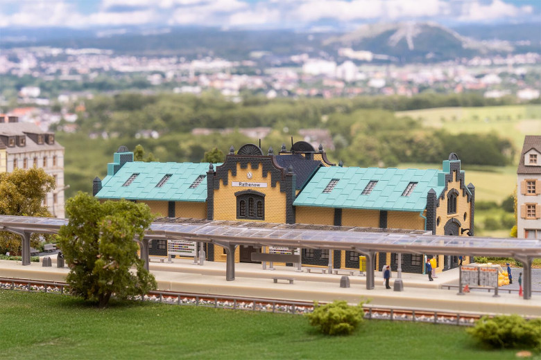 Dieses Modell fängt den Charme der Jahrhundertwende ein: hell-türkises Dach, helle gelbe Steinfassade und eine verglaste Bahnsteigüberdachung auf der Bahnseite verleihen dem Bahnhof Charakter. Die klare Klinkerbauweise und liebevolle Details machen ihn zu einem stimmungsvollen Mittelpunkt jeder Anlage. Das Modell ist architektonisch eigenständig und hat keinen Bezug zum Originalbahnhof in Rathenow (Brandenburg).