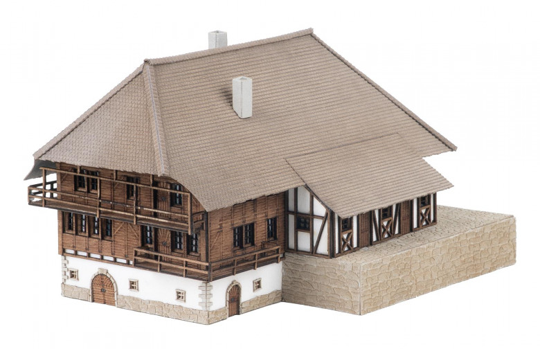Anlässlich unseres 80-jährigen Jubiläums rückt unsere Heimat – der Schwarzwald – in den Fokus unserer Modellwelt. Was uns seit jeher inspiriert, wird für ein Jahr besonders sichtbar: Die Kunst des Modellbaus – tief verwurzelt im Schwarzwald! Ein kleiner Schwarzwaldhof in warmer Holzoptik mit Fachwerkelementen und solidem Steinfundament lugt zwischen den dunklen Nadelbäumen hervor und verleiht der Landschaft ihren malerischen und unverwechselbaren Charme. Das tief herabgesenkte Eindach und die umlaufenden Balkone an zwei Seiten machen ihn zu einem Wahrzeichen des Schwarzwalds.
