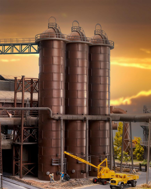 Dieses Miniaturmodell stellt drei Winderhitzer dar, die im Hüttenwerk eine zentrale Rolle spielen: Sie sorgen dafür, dass glühend heiße Luft durch die Heißwindringleitungen in den Hochofen strömt und das Eisenoxid in flüssiges Roheisen verwandelt werden kann. Das Modell ist präzise auf den Meidericher Hochofen abgestimmt und erweitert ihn um ein weiteres faszinierendes technisches Detail.