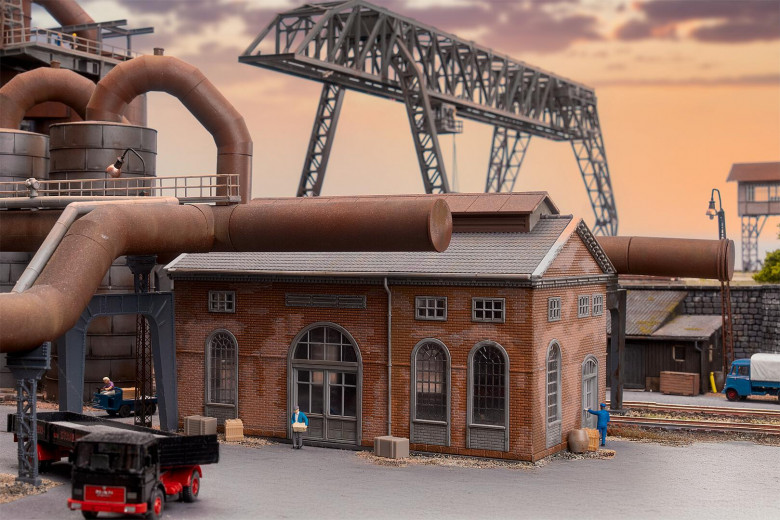 Dieses Miniaturmodell eines Backsteingebäudes mit Hochtank und ausgearbeiteten Rohrleitungen bildet in der Realität ein zentrales Element der Gichtgasreinigung in Hüttenwerken. Die industrielle Szenerie lässt sich mit dem separat erhältlichen Rohrleitungs-Set (Art. 180328) noch weiter ausbauen – für ein realistisches Gesamtbild im Hüttenwerksbetrieb. Das Modell ist abgestimmt auf das Modell des Meidericher Hochofens.