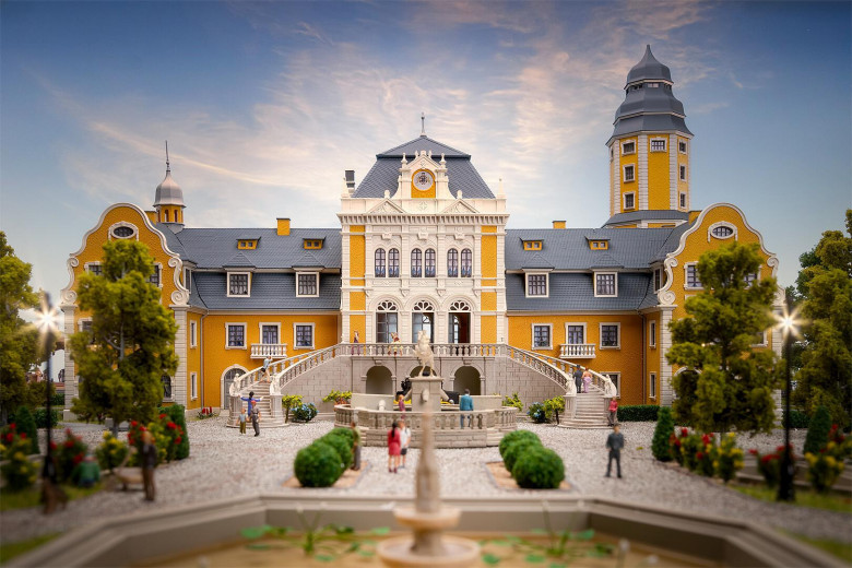 Dieses schöne Schloßmodell beeindruckt mit majestätischer Freitreppe, kunstvollen Verzierungen, markantem Turm und einer eleganten gelben Fassade. Inspiriert von barocken Residenzen des 17. und 18. Jahrhunderts verkörpert es die ganze Schönheit und Macht dieser Epoche. Die Barockzeit war geprägt von Macht und der kunstvollen Inszenierung von Gefühlen. Schlösser wie Versailles oder Ludwigsburg verkörpern bis heute diese Werte. Strenge Symmetrie, prachtvolle Architektur und überwältigende Raumwirkungen bestimmten das Bild jener Zeit. Dieses Modell greift diesen Geist auf und bringt ein Stück königlicher Baukunst auf die Modellanlage.