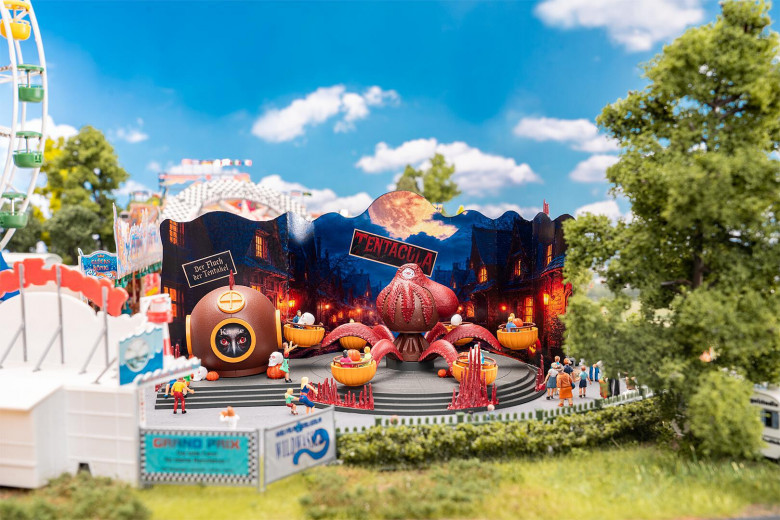 Unterwassergrusel in Miniaturformat – ein Highlight für jede Kirmes! Diese Kirmesattraktion entführt deine Miniatur-Besucher in eine gruselige Unterwasserwelt. Im Zentrum thront eine imposante Krake, die die Gondeln hält und sich mit diesen dreht. Ausgeschmückt ist das Set mit einem stimmungsvollen Grusel-Hintergrund und vielen liebevollen Details. Dank des integrierten DC-Getriebemotors mit präziser Platinensteuerung lässt sich die Drehgeschwindigkeit mühelos regulieren. Betrieben wird die Attraktion einfach über 5 - 12 V DC – so steht dem unvergesslichen Unterwassergrusel nichts im Weg!