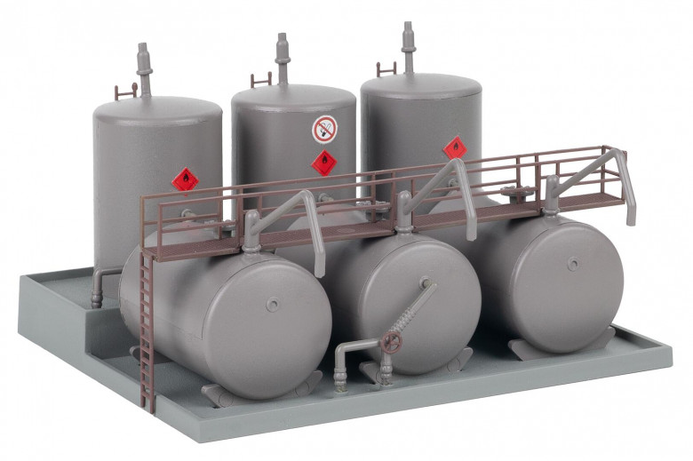 Oberirdisches Tanklager mit drei liegenden und drei stehenden Treibstofftanks. Robust gestaltet und detailgetreu umgesetzt, eignet es sich zur realistischen Ergänzung von Industrie- oder Hafenanlagen in Miniaturwelten.