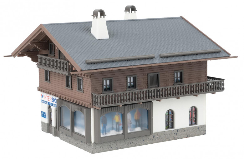 Modernes Sportfachgeschäft mit detailreicher Fassadengestaltung, großen Schaufenstern und authentischer Beschilderung. Das Gebäude ist im typischen Stil eines alpinen Sport- und Ausrüstungshauses ausgeführt und bietet vielfältige Möglichkeiten zur realistischen Einbindung in Wintersport- und Bergwelt-Szenen. Ob Skier, Snowboards oder Zubehör – dieses Modell vermittelt die Atmosphäre eines lebendigen Touristenortes und ergänzt hervorragend Bergdörfer und Wintersportanlagen auf der Modellbahnanlage.